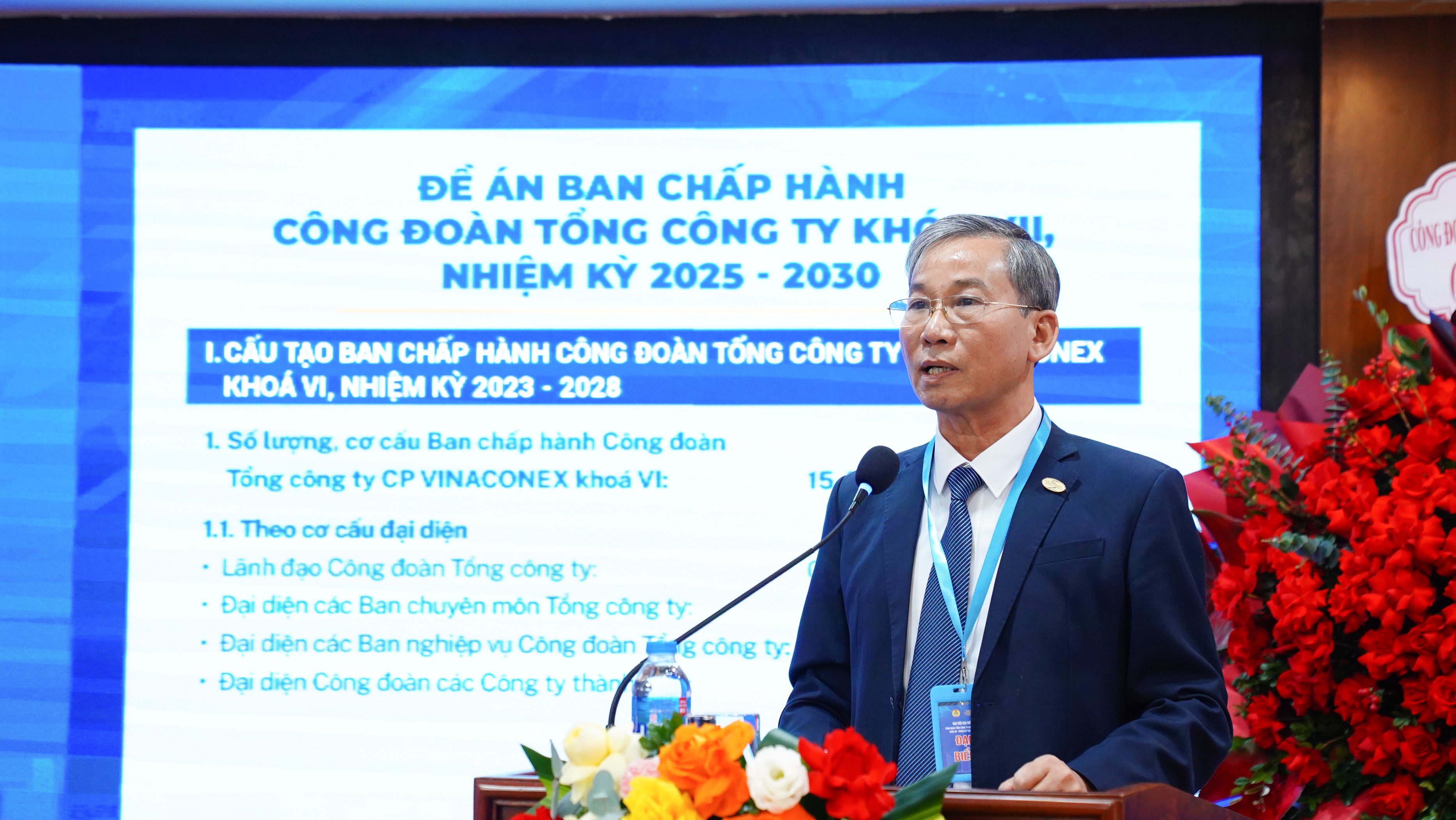 Ông Nguyễn Xuân Đông, Thành viên HĐQT, Tổng Giám đốc TCT tham dự và chúc mừng Đại hộiĐại hội Công đoàn TCT khoá VII, nhiệm kỳ 2025 - 2030 có ý nghĩa quan trọng, định hướng cho công tác kiện toàn tổ chức Công đoàn trong nhiệm kỳ mới theo chỉ đạo của Tổng Liên đoàn Lao động Việt NamĐại hội có sự tham dự của các đồng chí lãnh đạo TCT, các đồng chí nguyên lãnh đạo Công đoàn TCT, lãnh đạo các đơn vị thành viên trên toàn hệ thống128 đại biểu chính thức đại diện cho gần 4000 CBCNV, đoàn viên, người lao động trong toàn hệ thống VINACONEX tham dự Đại hộiCác đại biểu tham dự lắng nghe phổ biến về Quy chế làm việc của Đại hộiĐồng chí Hoàng Thiệu Bảo, Uỷ viên BCH Công đoàn TCT khoá VI trình bày báo cáo thẩm tra tư cách đại biểu Đồng chí Nguyễn Hải Lâm, Phó Chủ tịch Công đoàn TCT trình bày báo cáo kiểm điểm của BCH Công đoàn TCT khóa VIĐồng chí Nguyễn Mạnh Cường, Chủ tịch Công đoàn TCT khoá VI trình bày Đề án BCH Công đoàn TCT khoá VII, nhiệm kỳ 2025 - 2030Đồng chí Vũ Văn Mạnh, Trưởng Ban kiểm soát Công đoàn TCT trình bày báo cáo Dự thảo chính trị góp ý Đại hội XV Công đoàn Xây dựng Việt NamVới sự nhất trí 100%, các địa biểu tham dự đã thông qua các nội dung quan trọng của Đại hộiĐại hội tiến hành bầu BCH Công đoàn TCT khoá VII, nhiệm kỳ 2025 - 2030Các tiết mục văn nghệ đặc sắc chào mừng Đại hộiCô - trò Hệ thống Giáo dục Lý Thái Tổ biểu diễn văn nghệ chào mừng Đại hội