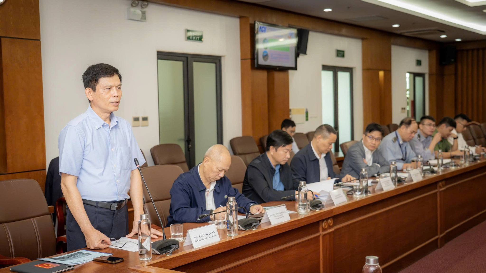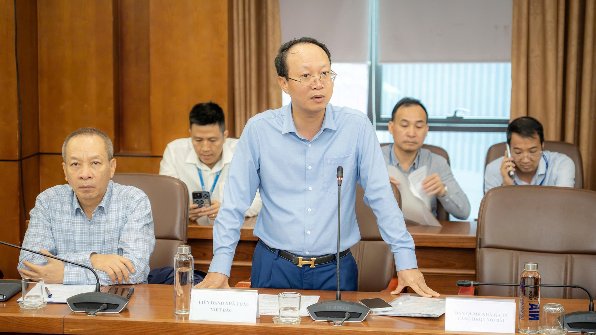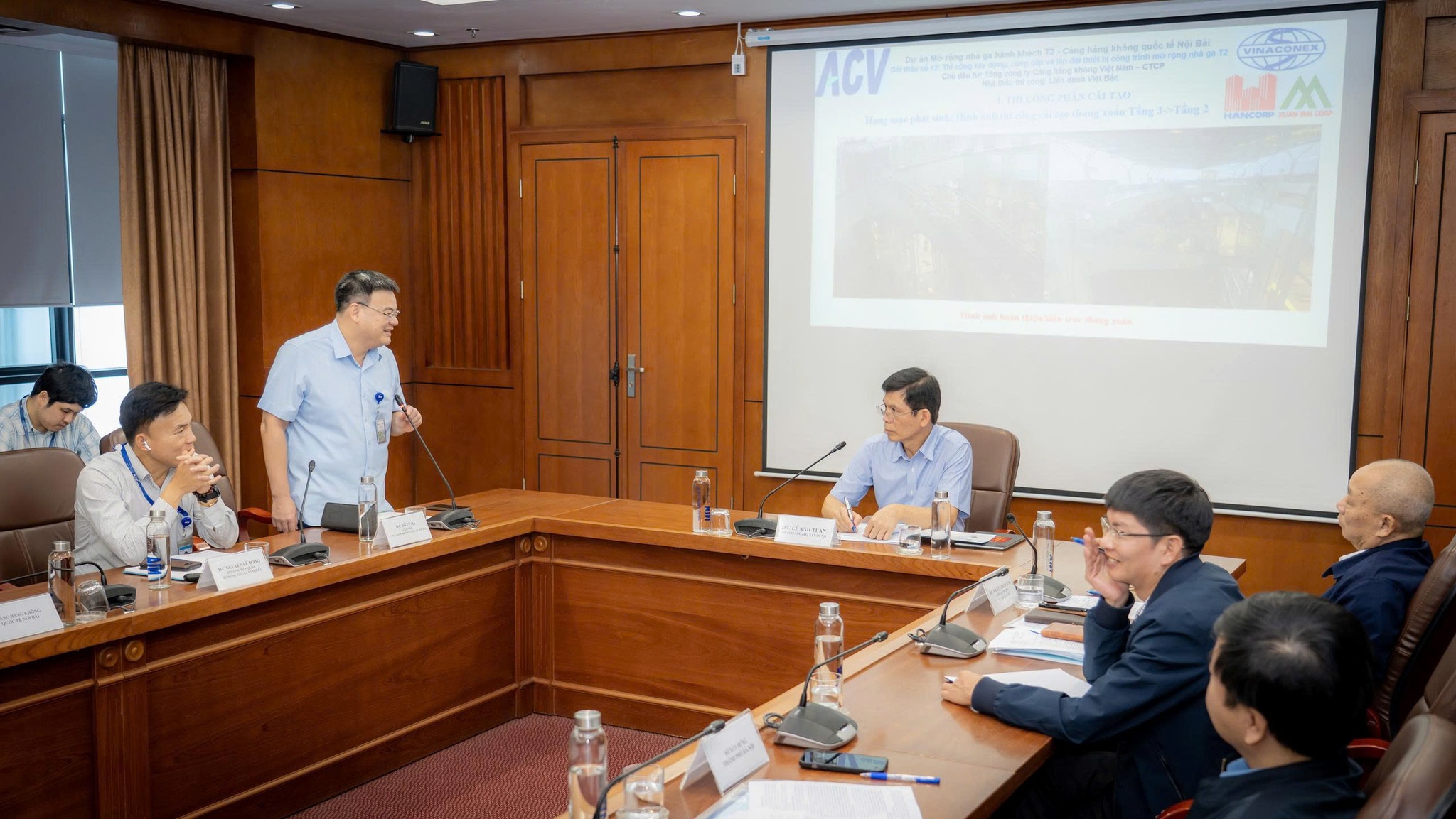 Ông Tô Tử Hà, Giám đốc Cảng Hàng không quốc tế Nội Bài cùng các đơn vị liên quan báo cáo hiện trường, phương án nghiệm thu-vận hành thử-bàn giao và các giải pháp an toàn, an ninh, phòng cháy chữa cháy, công nghệ thông tin giai đoạn hoàn thiện.