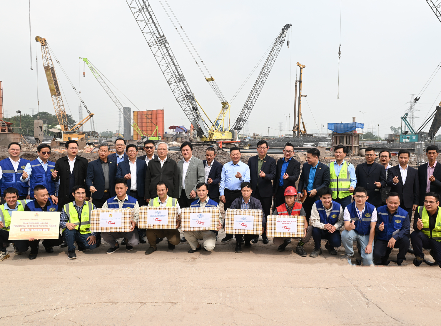 Ông Trần Đình Tuấn, Phó Bí thư Đảng uỷ, thành viên HĐQT, Phó Tổng giám đốc và ông Nguyễn Khắc Hải, Phó Tổng giám đốc Tổng công ty trao quà tặng động viên các nhà thầu trên công trường