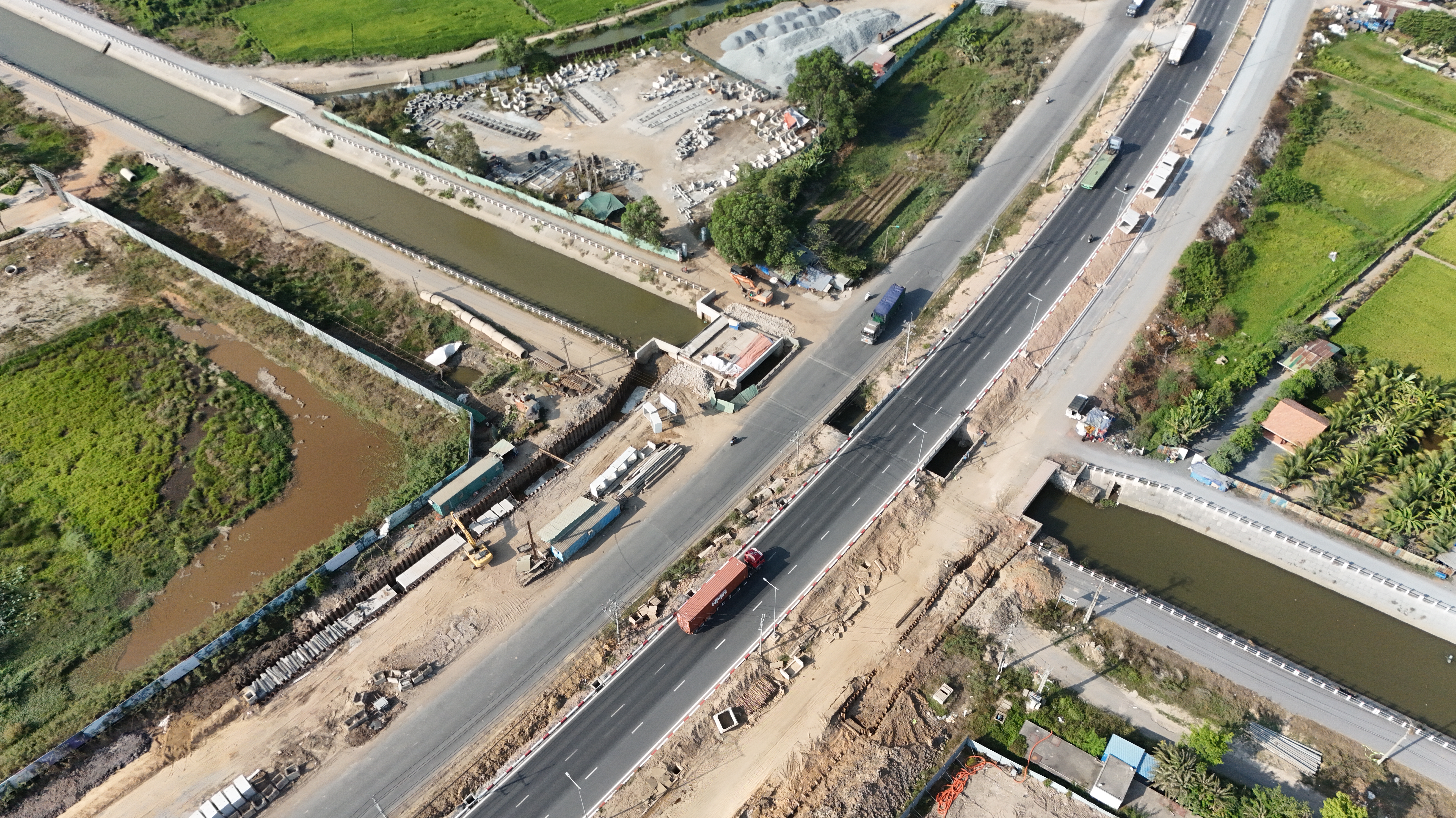 + Đoạn 1 (từ Km0+000 đến Km4+973): Mặt đường chính 12m x 2 bên, đường song hành 10m x2 bên, dải phân cách giữa 7m, dải phân cách biên 4,5m x 2 bên, vỉa hè 10m x 2 bên.